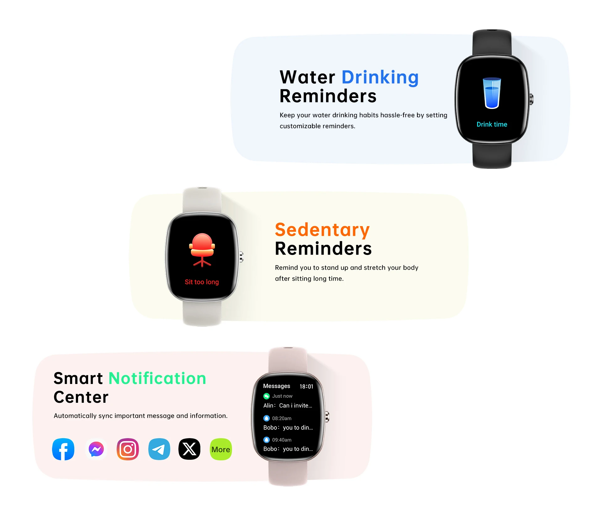 Function: fitness tracker, sleep tracker, Message Reminder, Call Reminder, Answer Call, Dial Call, Alarm Clock, Calorie Counter, Calculators