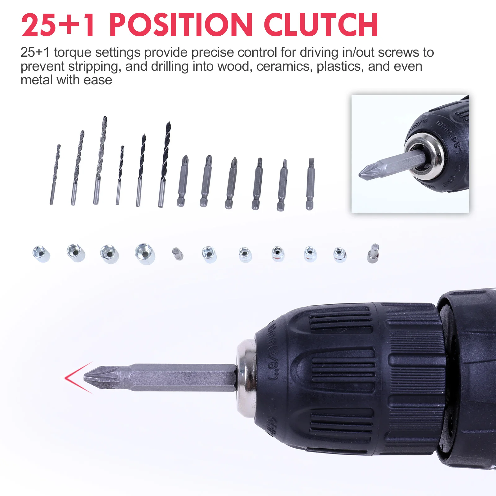 [25+1 Position Clutch]: 25+1 torque settings provide precise control for driving in/out screws to prevent stripping, and drilling into wood, ceramics, plastics, and even metal with ease.