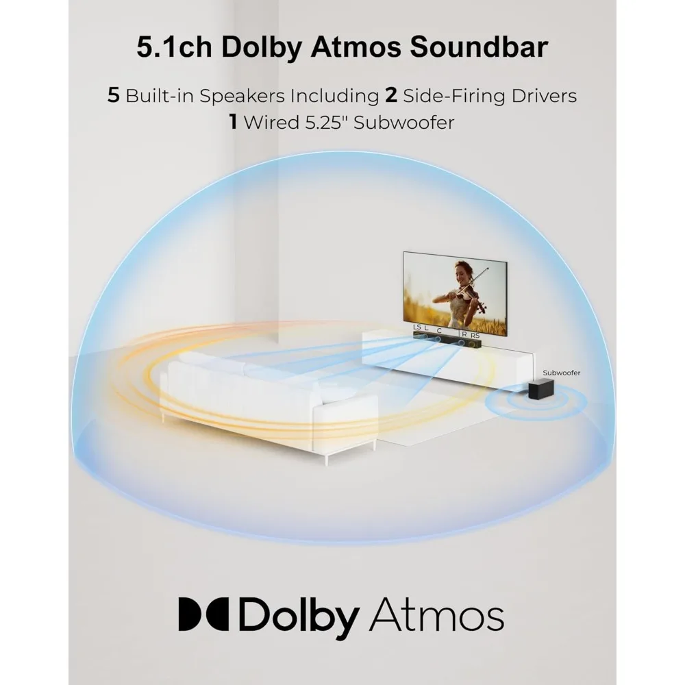 - Simplified 5.1ch Dolby Atmos Setup: Enjoy immersive 4D sound with real Dolby Atmos and 5.1-channel audio. Five built-in speakers, including two side-firing drivers, create a wide surround without rear speakers. Precision DSP ensures <0.5 ms latency for smooth, theater-like sound. Setup takes less than 1 minute.
