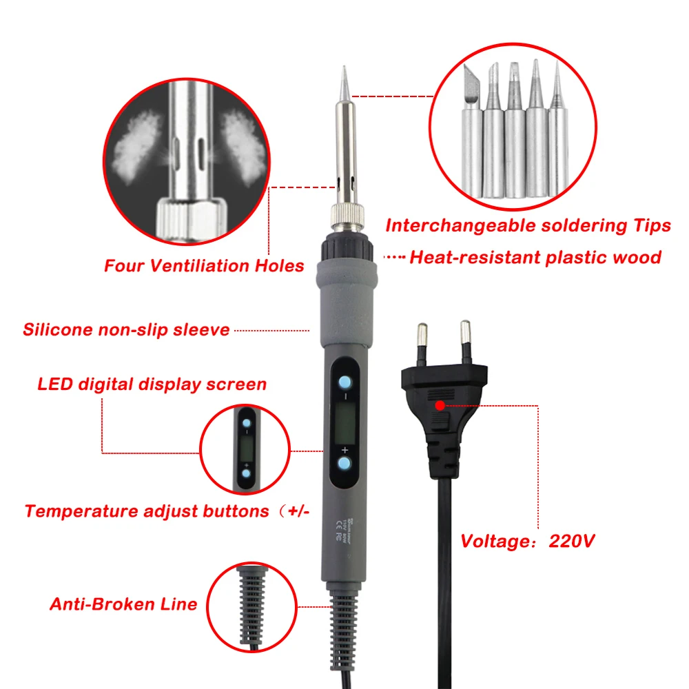 This professional soldering tool is great for lead-free soldering semiconductors with adjustable temperature-controlled soldering irons: 200-450 ° C.