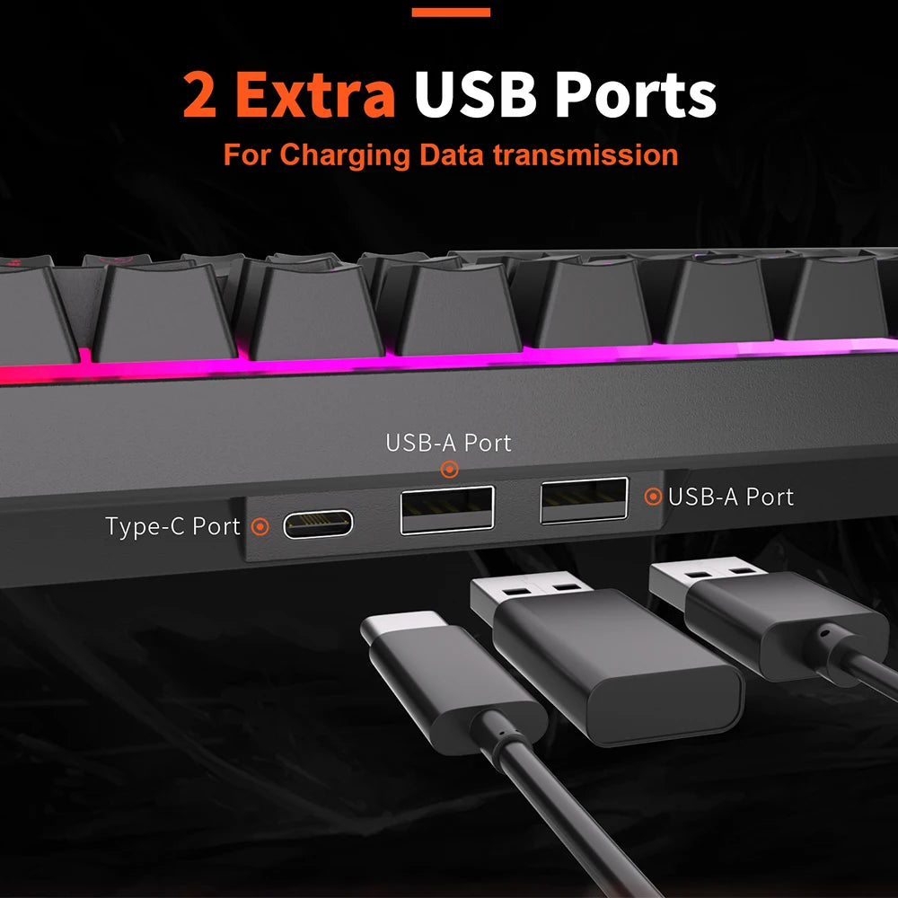 7. Hub Design - This wireless mechanical keyboard is armed with 2 built-in USB pass-through ports and 1 Type-C Portallowing to back up more facilities