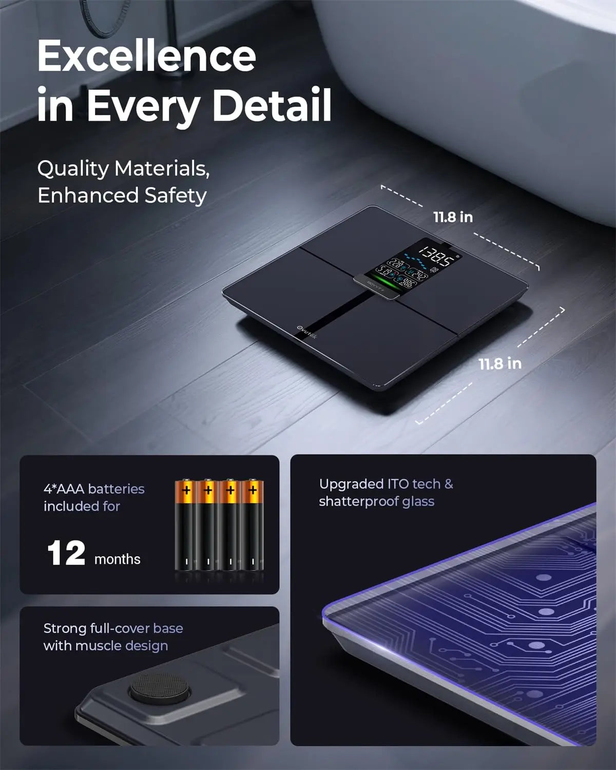 2. Durable and Safe Design: Built with a sturdy 11.8x11.8-inch platform and a robust capacity of up to 450 pounds. The scale incorporates anti-slip pads and shatterproof tempered glass on a full-cover base for enhanced stability and safety during use.